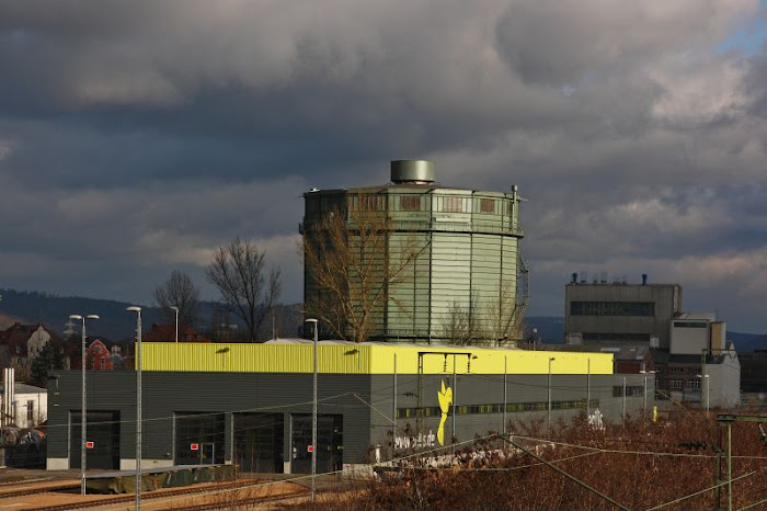Bei der Suche nach ein paar Daten über das Gaswerk bin ich auf die sympathischen Seiten von Oliver Frühschütz gestoßen, der Informationen über Gaswerke zusammengetragen hat. So weiß ich jetzt, dass es sich um ein Scheibengaswerk handelt, eine Gasbehälterart, die 1913 patentiert wurde und erstmals ohne Wasser als Dichtmittel auskam. In der Mitte des Turms ist also eine Scheibe, die das Gas darunter "deckelt", darüber ist normale Luft. Die Scheibe ist in der Höhe variierbar. Sehr schön erklärt ist das auf folgender Webseite: http://www.gaswerk-augsburg.de/scheibe.html