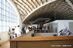 Auch im ersten Stock gibt es Essen und Getränke, ferner workshops. Hier sieht man übrigens die Deckenkonstruktion des Architekten Zollinger (daher der Name Zollingerhalle, oder Zollingerdecke)